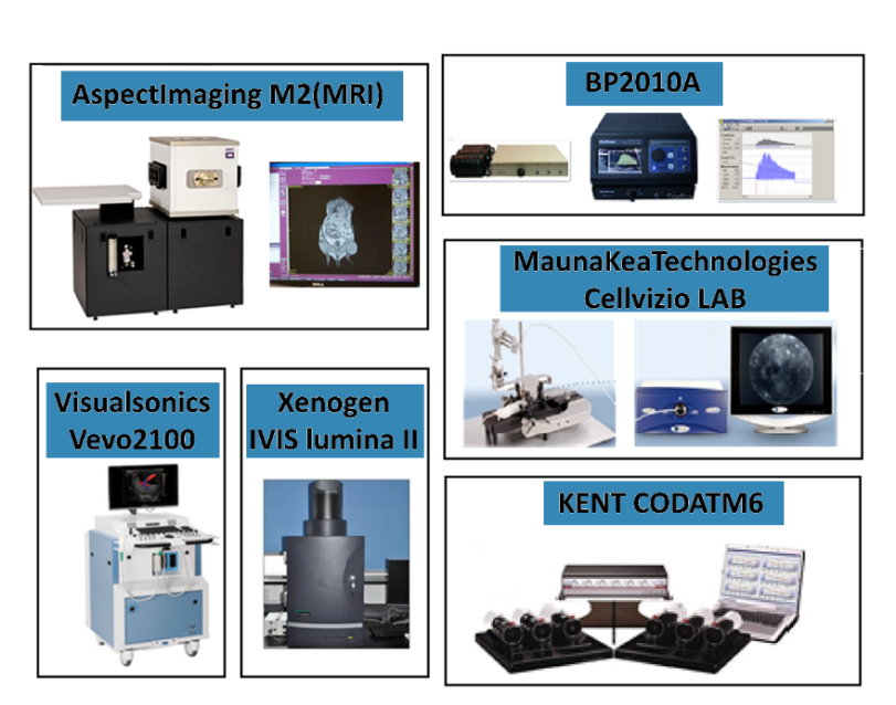 Several instruments have been introduced to the Experimental Center for the Noninvasive Imaging of Small Animals Platform, including a small animal in vivo imaging system, an animal ultrasound imaging system of ultra-high resolution, a compact MRI system of high performance, a pressure myograph system, an noninvasive arterial blood pressure monitor, an implantable biotelemetry system, and a small animal blood pressure electrocardiogram (ECG) telemetry system. The platform supports monitoring and analyzing blood pressure, heart rate changes, hemodynamic changes, cardiac function, and blood vessel diameter, and allows reconstruction of anatomical core dynamic cycles. It is a powerful platform for integrating in vitro studies with in vivo studies of living animals.
